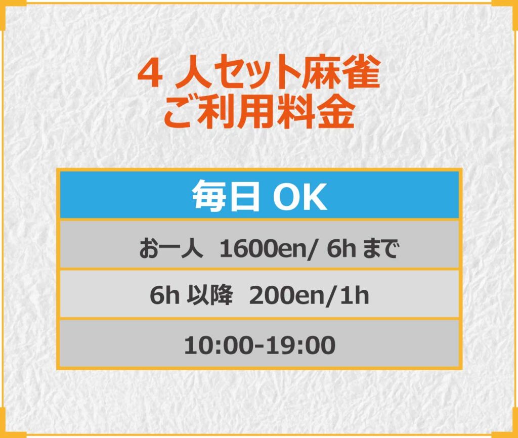 | 全台点数表示付の麻雀卓を使用可。椅子を使用するため、腰痛の負担軽減になります。 | |